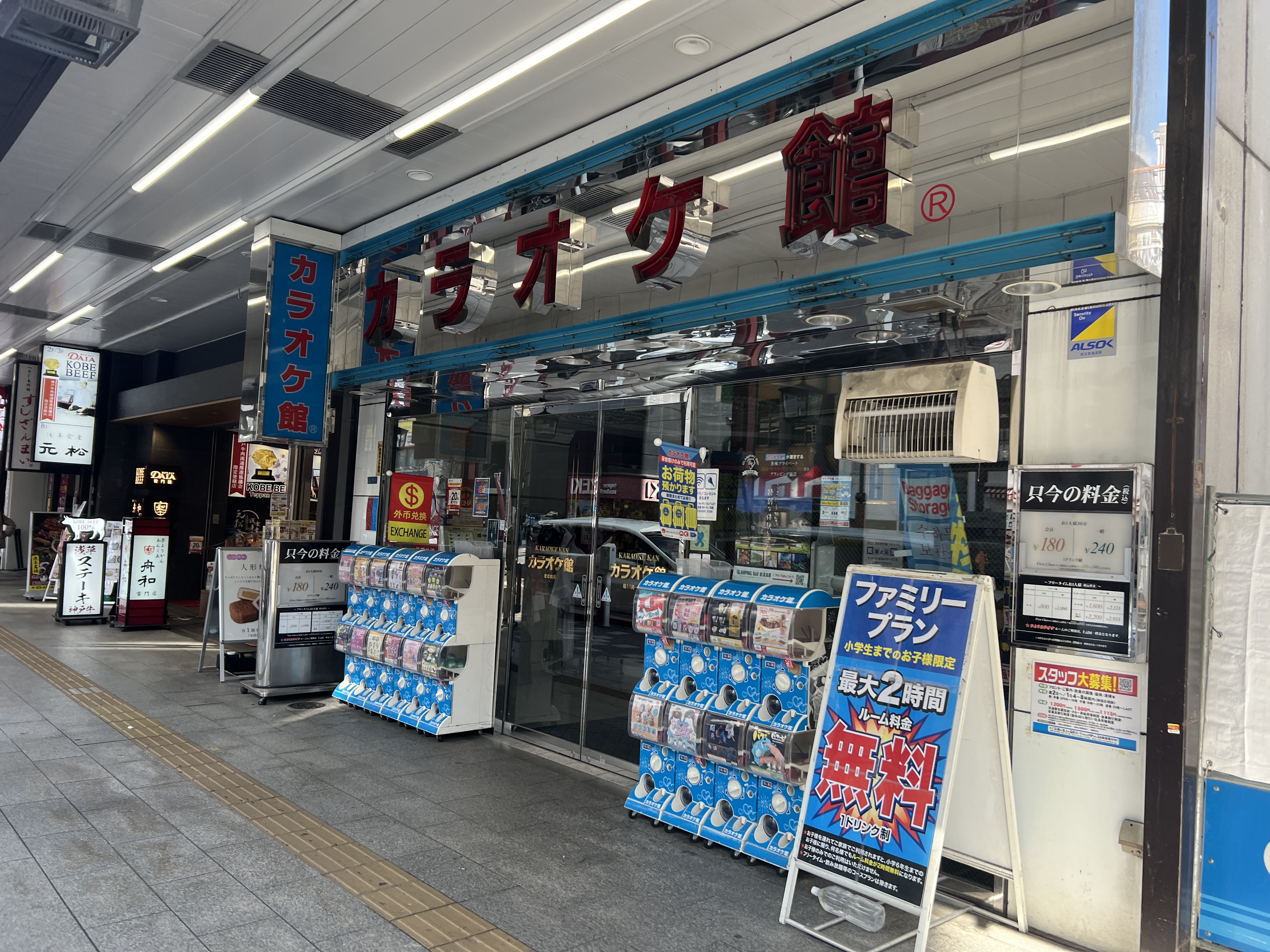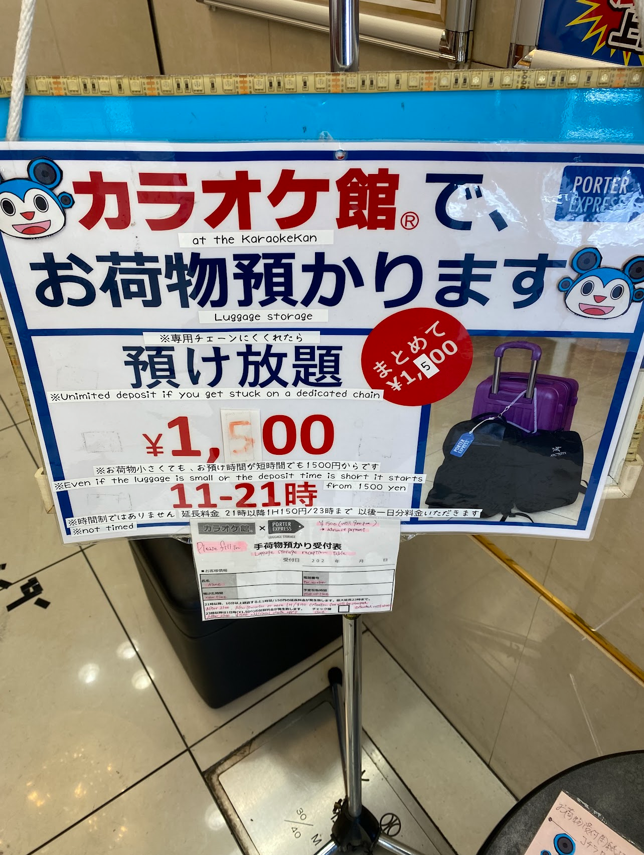 아사쿠사 카미나리몬 옆에 있는 노래방인 '가라오케 관 카미나리몬점'입니다. 노래방의 부수입으로 짐보관 서비스도 병행하고 있습니다. 이 곳에서는 짐 갯수당 가격이 아닌 '한 체인'당 1,500엔의 요금을 부과하는데요, 몇 개의 짐을 가져가더라도 하나의 체인에 들어가면 1,500엔에 보관할 수 있습니다.