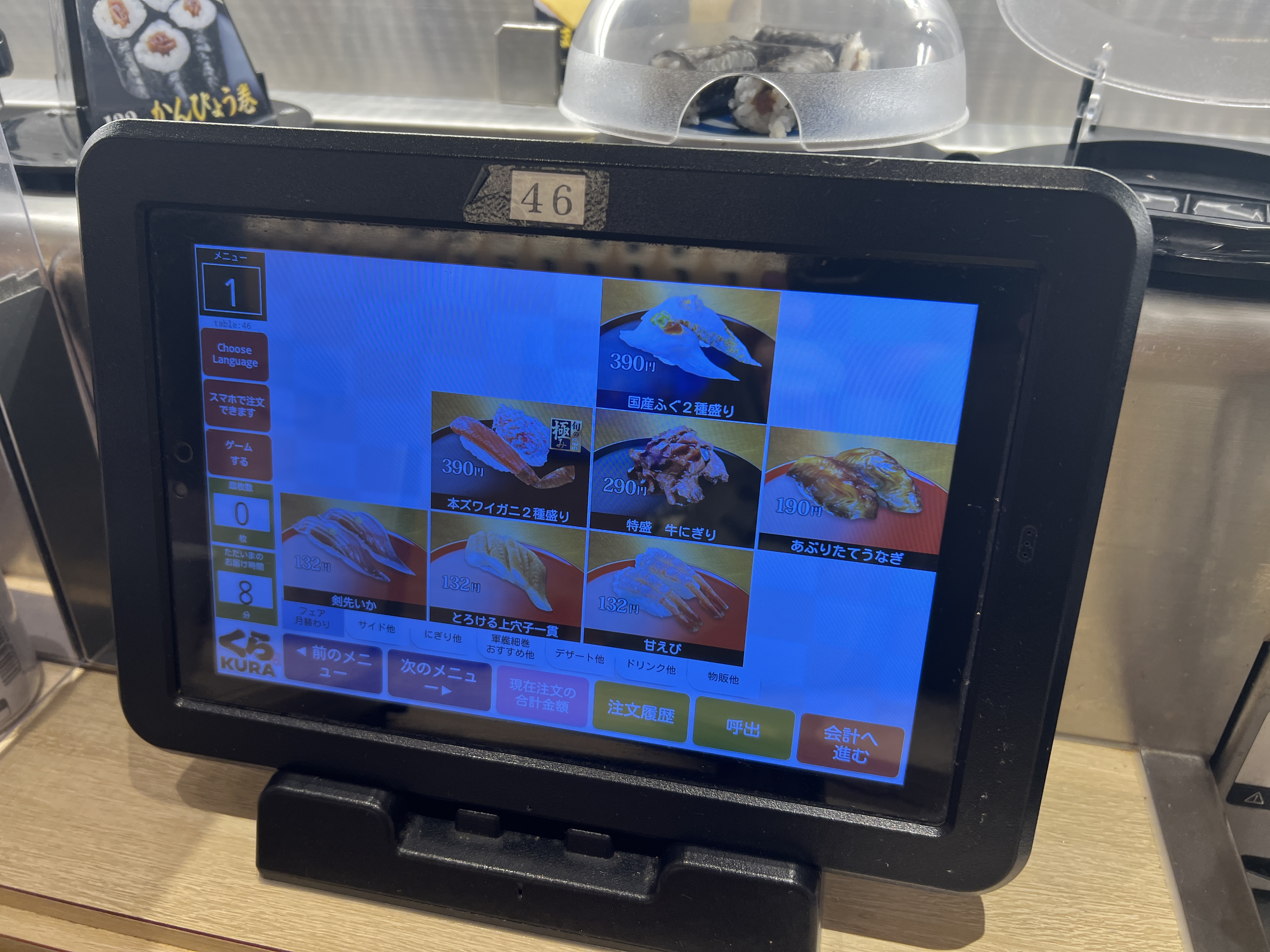 주문 후 초밥이 나오는 시간은 조금 걸리는 편입니다. 인내심을 가지고 기다리다 보면 태플릿에 '주문한 초밥이 나옵니다' 라는 말과 함께 초밥이 등장합니다.