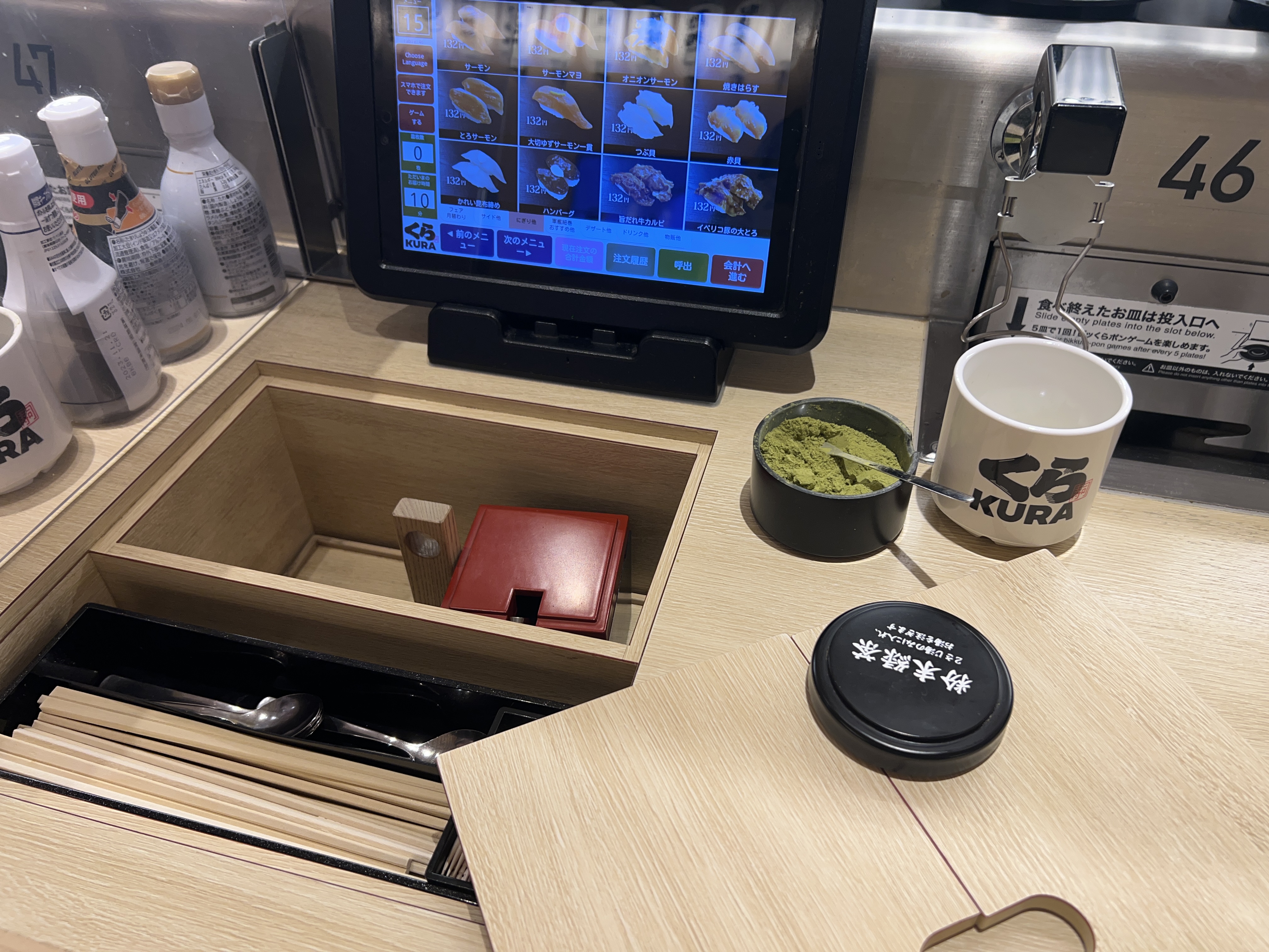 말차, 생강, 젓가락, 간장, 와사비 등 모두 셀프로 하실 수 있습니다.