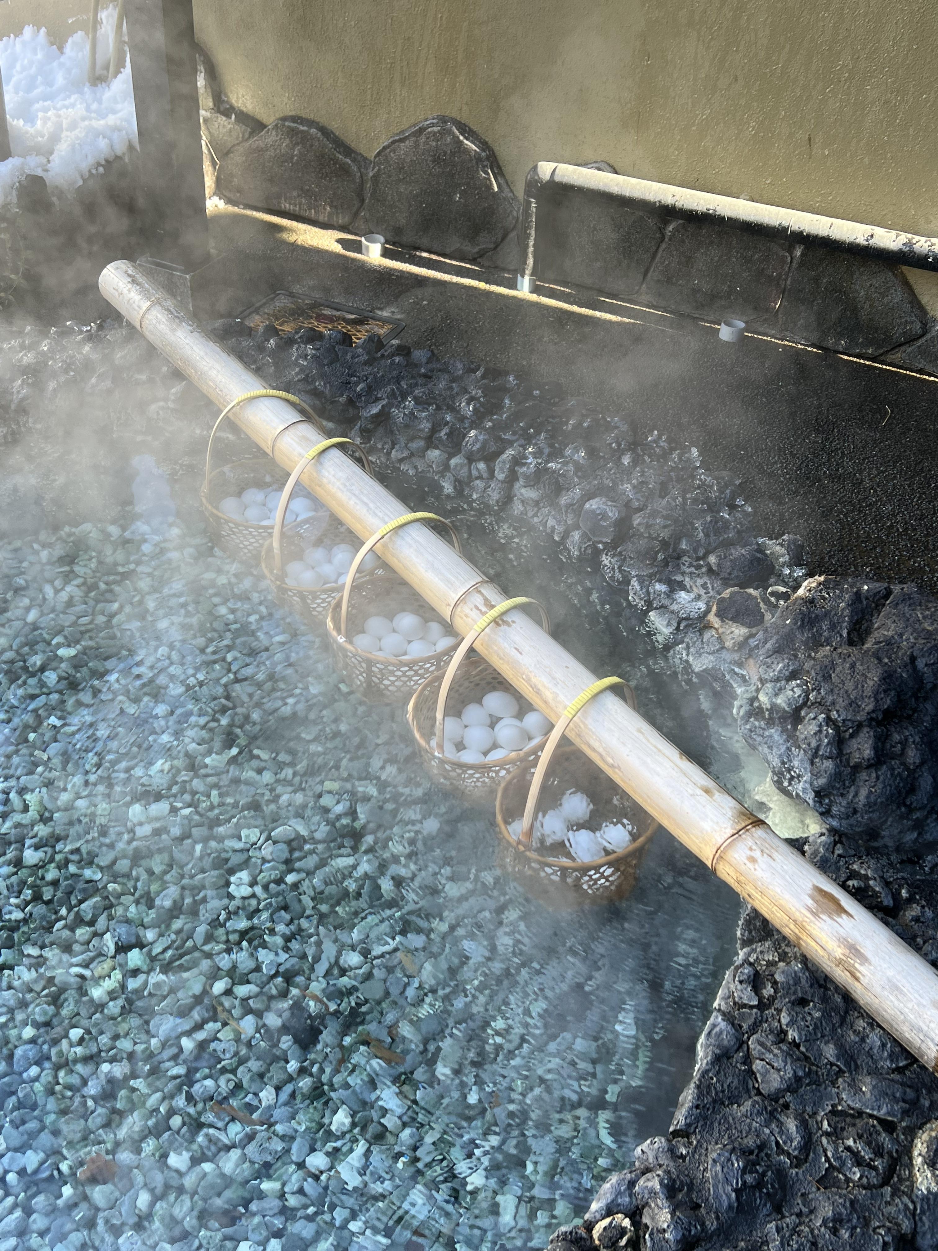 다음 날 아침, 다른 온천으로 가기 위해 발걸음을 옮기는 중 온천달걀(온센타마고)을 발견했다. 말 그대로 온천물에 뎁힌 달걀인데, 달걀 안에 온천의 향이 그대로 베어있다. 온천 물이 끓는 물은 아니기 때문에 반숙보다도 덜 익혀진 달걀이지만, 입 안에 후루룩 넣어먹으면 온천의 성분이 피부가 아닌 몸 안까지 들어오는 느낌을 받을 수 있다.