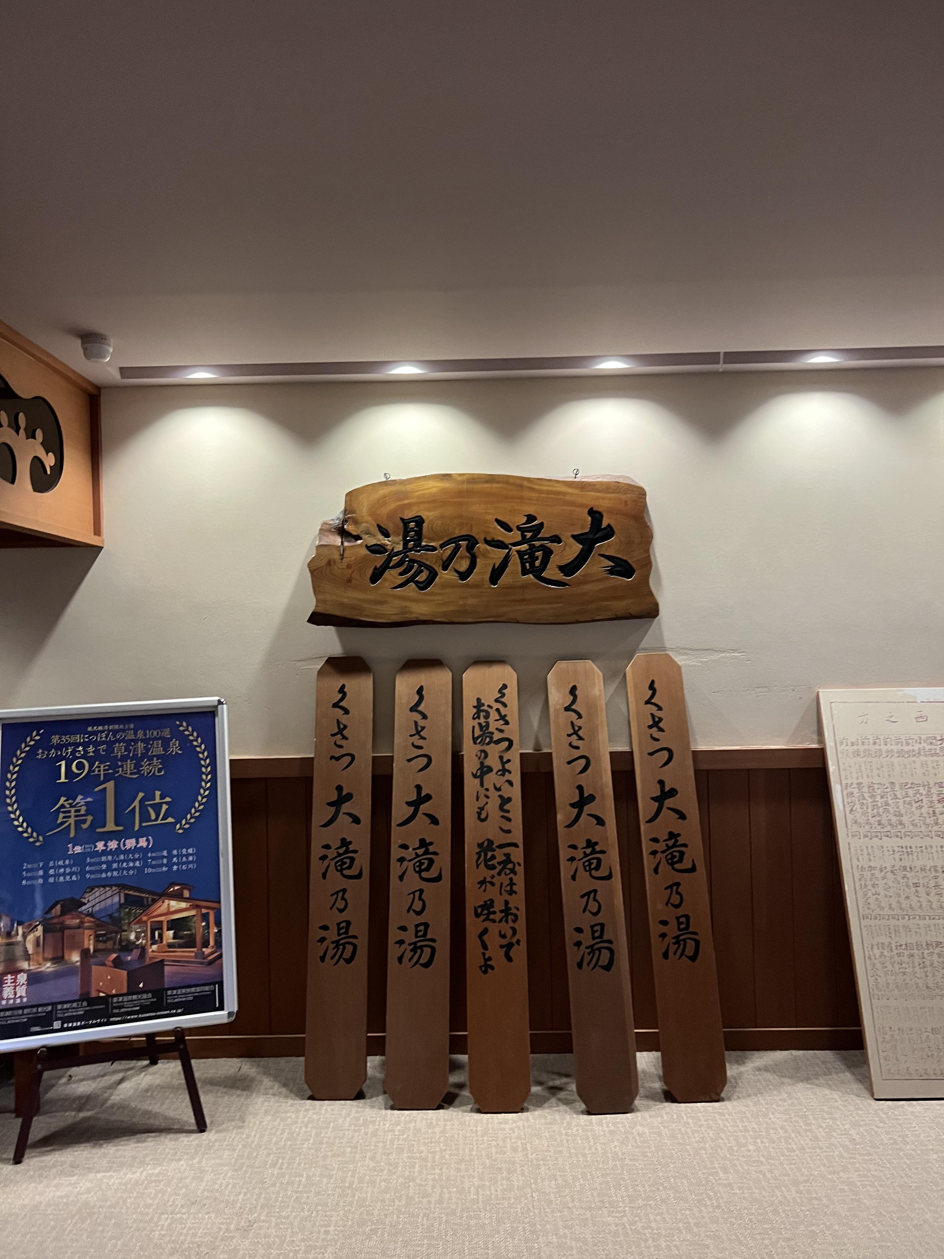 내부 사진은 찍지 못했지만, 홈페이지에 접속하면 관내 시설이 상세하게 설명되어 있다. 유모미 나무막대기를 이용해 홍보를 하는 모습이 재미있어 찍었다. 이 곳의 기념품 상점을 추천하는데 쿠사츠 온천의 원료를 이용해 만든 입욕제가 있다. 이 곳에서만 파는데 가격도 개당 150엔 전후라 아주 저렴한 편이다.