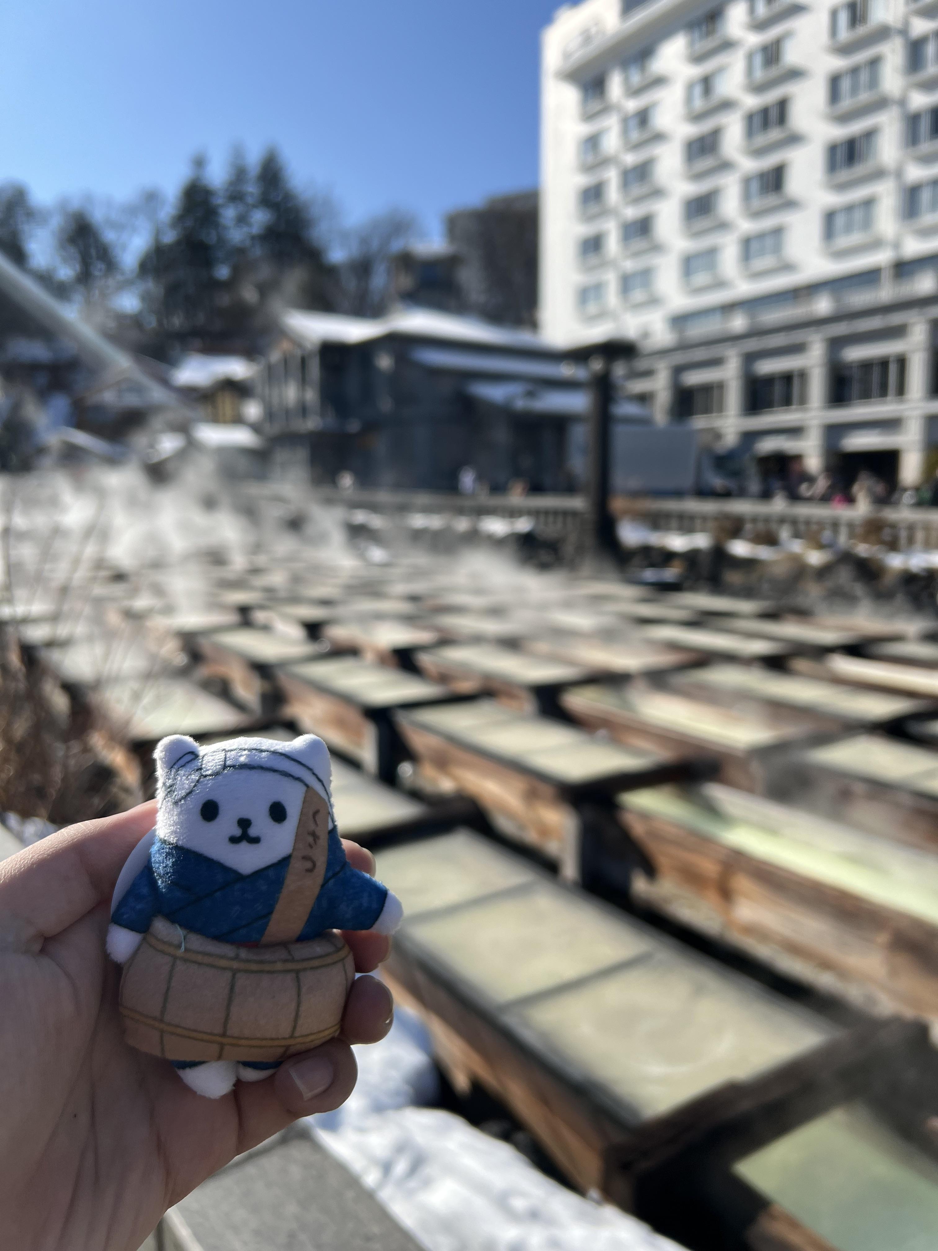 돌아가는 길에 아쉬워 쿠사츠를 대표하는 인형과 함께 유바타케에서 마지막 사진을 남기고 떠난다. 쿠사츠 온천은 '현지에서만 할 수 있는 경험'의 측면에서 독보적인 경험을 제공할 수 있기에 세계의 유수한 온천지 어디하고 비교해도 손색이 없다고 본다.